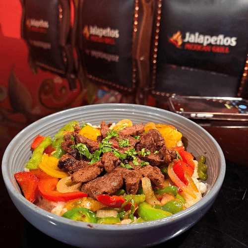 Fajita chicken or steak with grilled green peppers, onions, corn, tomatoes, and black beans. Topped with queso dip and pico de gallo. Severed in a bowl over Spanish rice