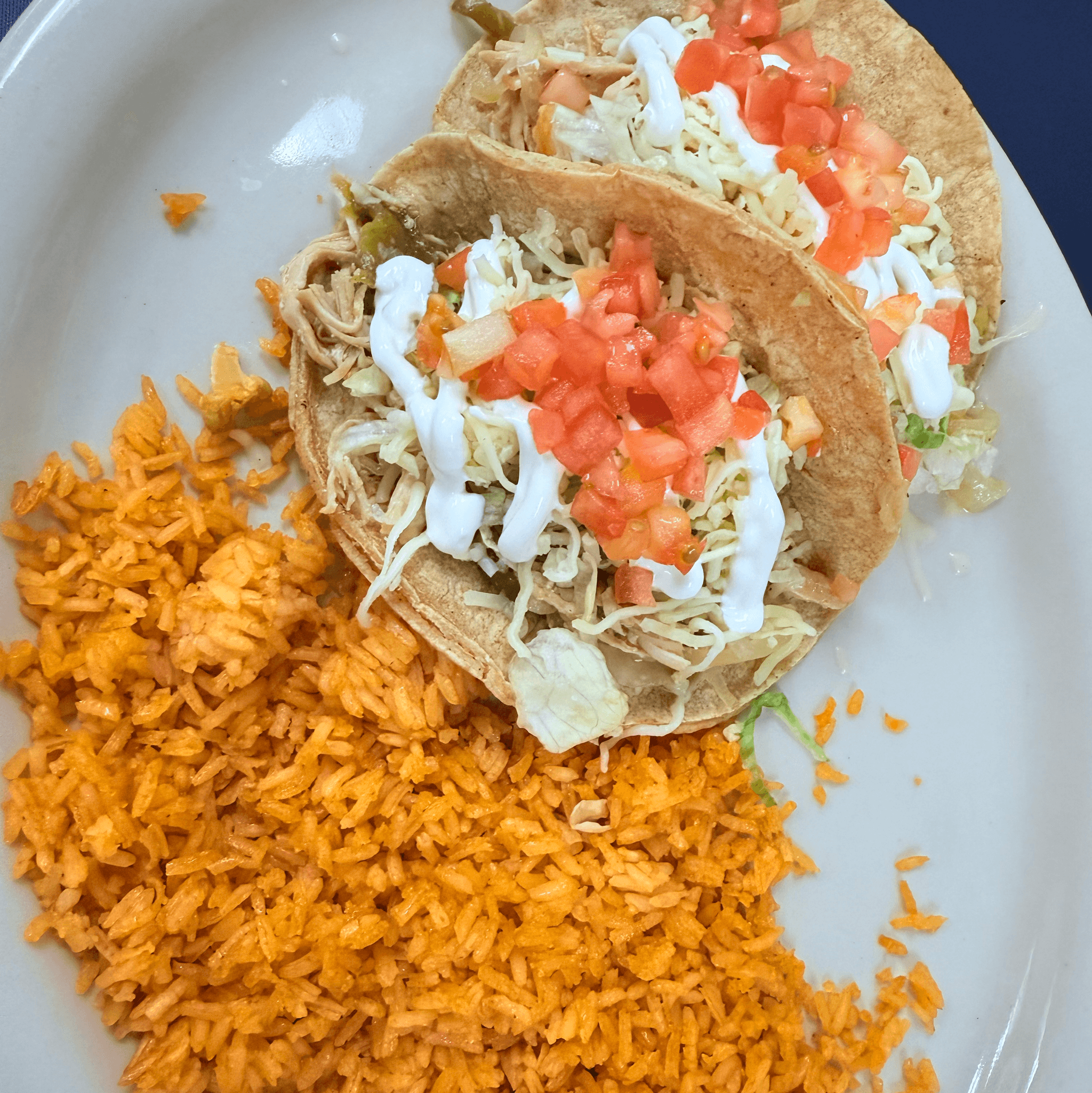 Three corn tortillas filled with shredded chicken cooked with onions, peppers and tomatoes then topped with green sauce and queso fresco. Served with Spanish rice, lettuce, sour cream and avocado