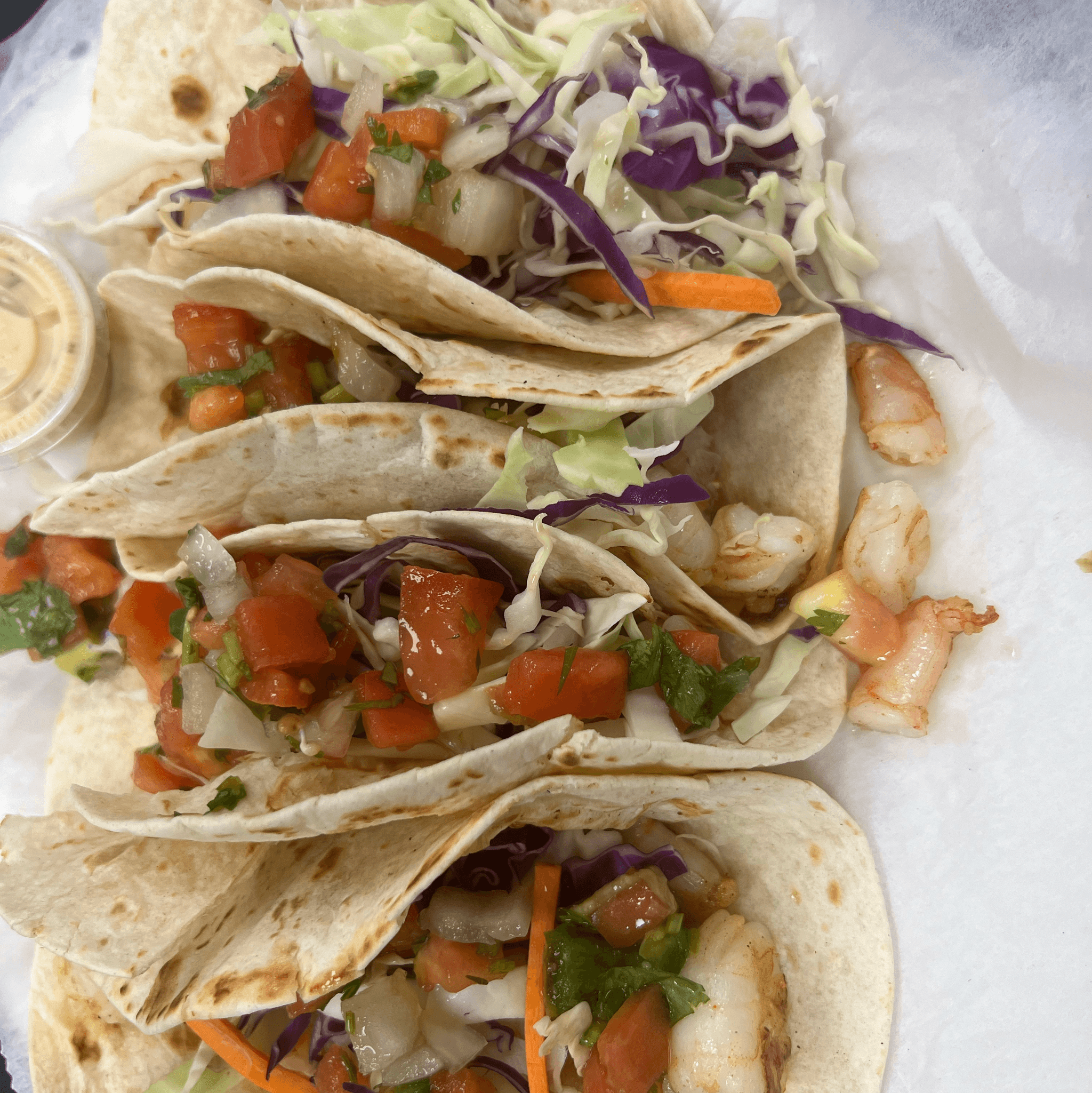 Flour tortilla stuffed with grilled shrimp and shredded cheese cooked with onions, peppers, and tomatoes. Served with lettuce, sour cream, and tomato,