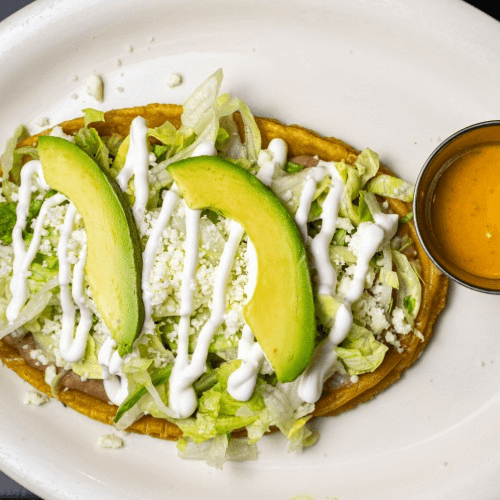 Popular Mexican dish made with masa (corn dough) deep-fried then topped with refried beans, grilled chicken or steak, chorizo, lettuce, sour cream, avocado slices, and queso fresco