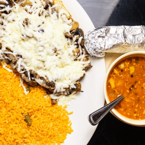 Chicken or steak grilled with bacon, onions, and mushrooms, covered with melted shredded cheese. Served with Spanish rice, charro beans, and corn or flour tortillas