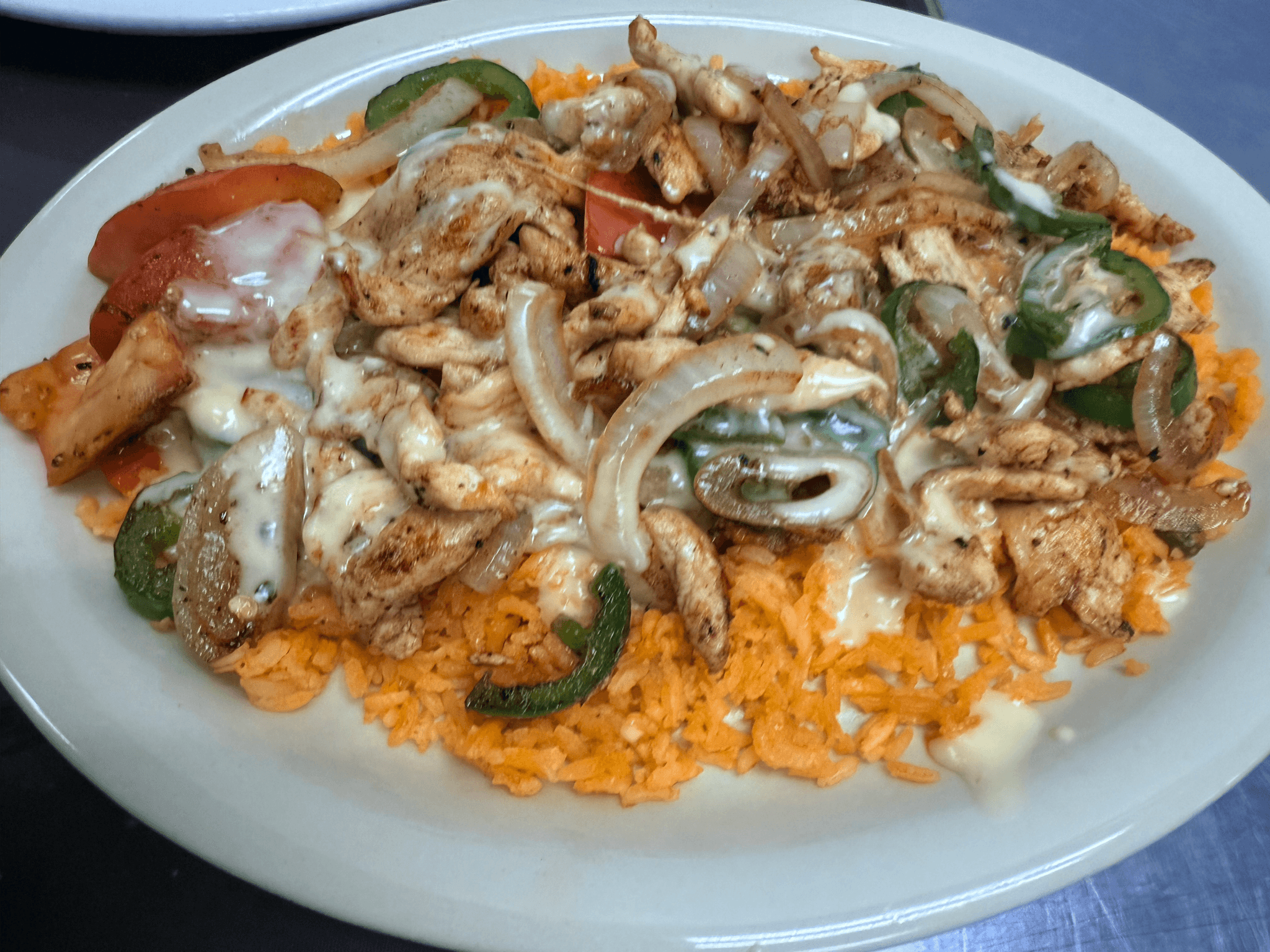 Grilled seasoned chicken or steak with onions, tomatoes, peppers or jalapeños. Served over. Spanish rice and covered with queso dip, corn or flour tortillas