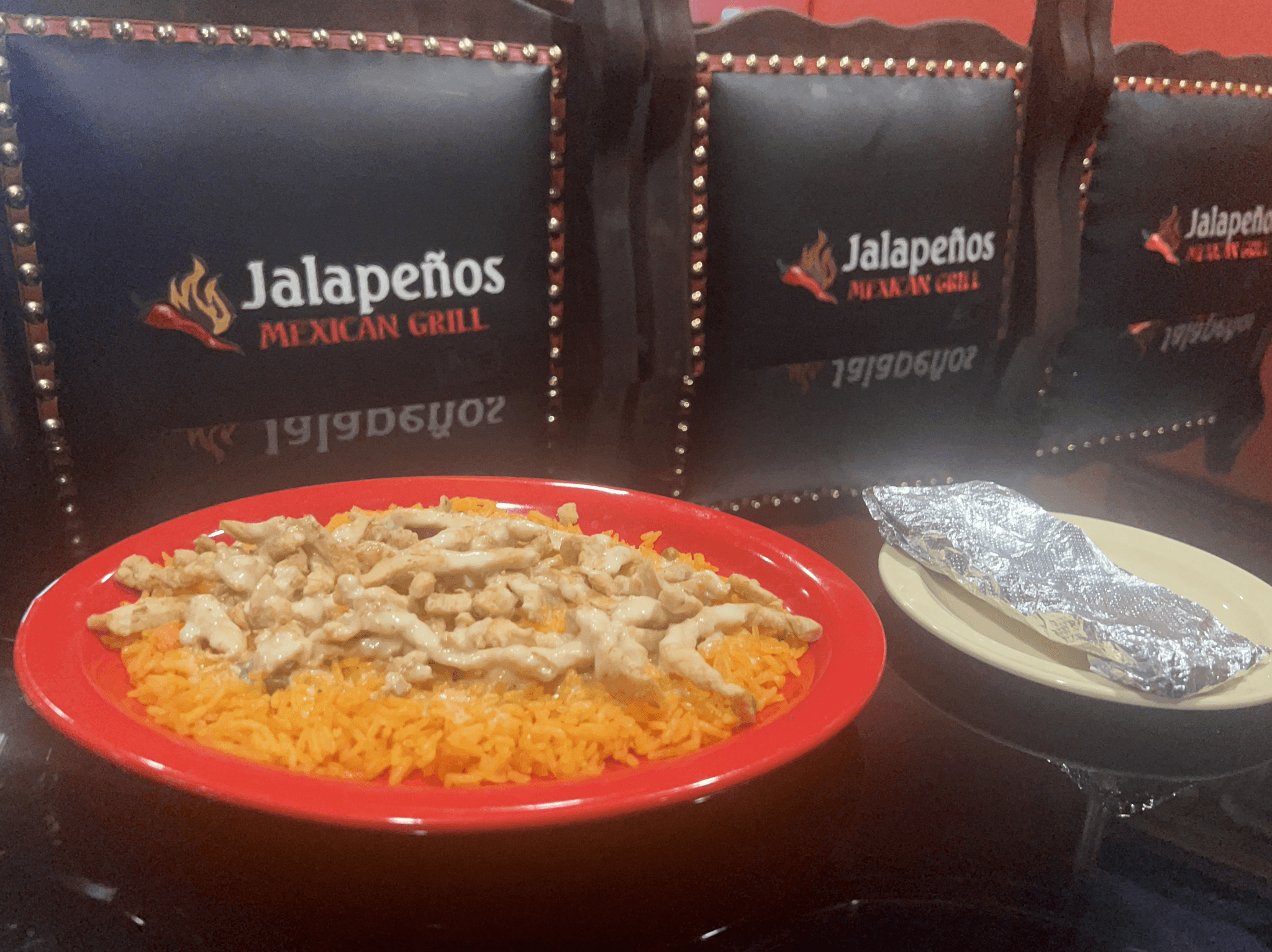 Three flour tortillas filled with grilled chicken, roasted corn, poblano peppers and onions then covered with chipotle sauce and sour cream. Served with Spanish rice